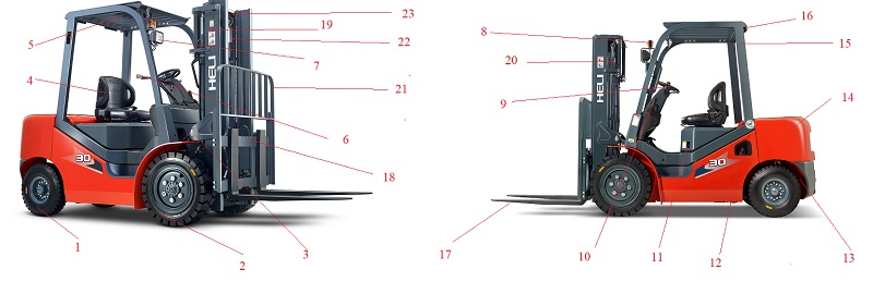 Chúng ta cùng tham khảo qua cấu tạo các bộ phận trên xe nâng diesel 3 tấn của hãng Heli: