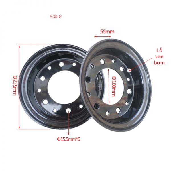 La zăng sau xe nâng 500-8 dùng cho xe diesel 1-1.5-1.8 tấn gồm 2 mâm ghép với nhau thành một khối nhờ các bulong.