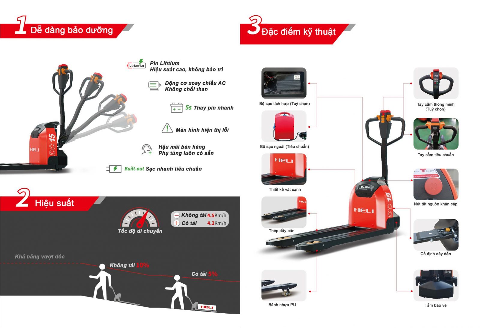 - Xe nâng tay chạy điện HELI có tải trọng nâng 1,5 tấn ; 1,8 tấn; 2 tấn. Có kích thước nhỏ gọn, làm việc hiệu quả là dòng xe phù hợp với các môi trường công nghiệp, có nhà xưởng sạch sẽ, bằng phẳng.